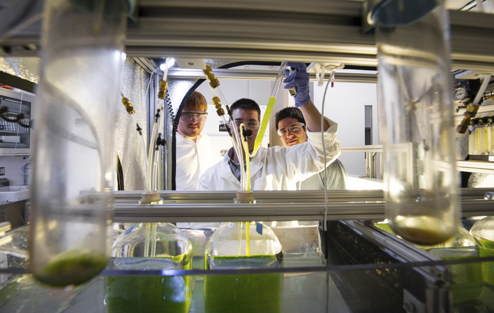 April 26, 2013 – L-R, Robert Sebag and Will Long watch Nick Sweeney, center, inoculate algae being grown in a tent reactor. The reactor, developed at NREL, controls light, CO2 delivery and temperature to establish baseline growth curves and recreate real world growth conditions, allowing researchers to grow denser cultures in less time in the algal lab in the Field Test Laboratory Building (FTLB) at the National Renewable Energy Laboratory in Golden, CO. (Photo by Dennis Schroeder / NREL)