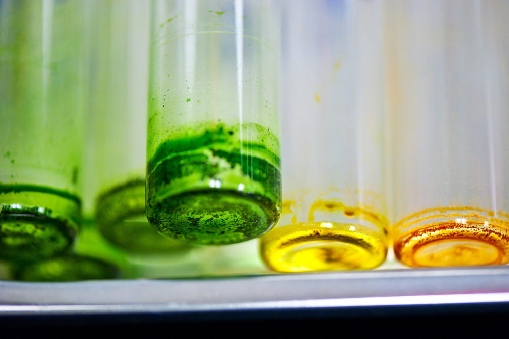 These test tubes in an NREL algae lab hold a selection of lipids, or oils, that have been extracted from several algal strains. The tubes illustrate the colorful variety of work being done at NREL under a new aquatic species program.